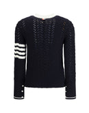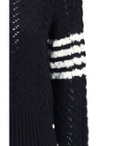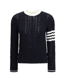 The pointelle Sweater by Thom Browne is a stylish and versatile piece with a ribbed crew neck, cuffs and hem. The pointelle knit creates a refined texture, while the iconic three bands on the right sleeve mark its identity. A mix of classic and sporty, perfect for any occasion.