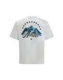 The Mountain T-shirt by Amiri uses soft cotton as a minimal canvas for bold visual storytelling. A classic round neckline and clean, straight silhouette anchor the piece, while the contrasting logo on the chest anticipates the mountain artwork on the back—an element that amplifies the graphic identity of the T-shirt. Finished with tonal stitching and short sleeves, it delivers an elevated yet effortless look.
