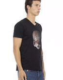 Embrace the epitome of casual sophistication with Trussardi Action’s latest creation. This sleek, black V-neck T-shirt, accented by a distinctive front print, strikes the perfect balance between effortless style and comfort. Crafted from a luxurious blend of cotton and viscose and bearing the hallmark of quality from its origins in Bangladesh, this piece is a true testament to the brand’s commitment to contemporary design. Bold, trendsetting, and undeniably fashionable, it’s made for those who lead with confidence and a sense of adventure. Elevate your wardrobe with this chic, must-have staple.