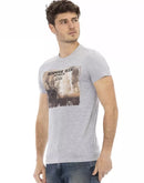 Elevate your wardrobe with the bold sophistication of Trussardi Action. This sleek, gray T-shirt boasts a striking front print that embodies the brand’s flair for combining trendy design with classic style. Crafted from a premium blend of cotton and viscose, experience unrivaled comfort and durability. Made with discerning attention to detail in Bangladesh, this piece is a must-have for the fashion-forward individual.