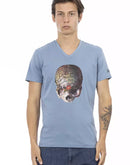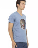 Elevate your wardrobe with the epitome of casual sophistication from Trussardi Action. This light blue short sleeve T-shirt dazzles with its understated V-neck style and a distinctive, eye-catching front print that sets you apart from the rest. Perfect for the man who appreciates fashion-forward attire with the comfort of quality materials.