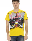 Indulge in the bold flair of Trussardi Action with this striking short sleeve T-shirt. Crafted for the modern trendsetter, it features a round neck that exudes casual elegance, complemented by a captivating front print that commands attention. The sunny yellow hue is perfectly balanced with the softness of cotton and the fluid drape of viscose, allowing for both comfort and style. Proudly originating from BD, this piece ensures you shine with confidence at every outing.
