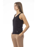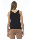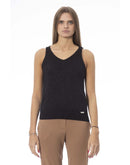 Elevate your style quotient with the Baldinini Trend’s V-neck Tank Top—a classic piece with a contemporary edge. Crafted from a sumptuous blend of fabrics including viscose and cashmere, with a touch of polyamide and lam for texture and durability, this top is more than just clothing; it’s a statement. The neck and bottom dazzle with fine ribbed knit detail, while the monogrammed Baldinini Trend in metal adds a distinctive, luxurious accent that’s sure to turn heads. Sophisticated in black, it’s an embodiment of modern chic.