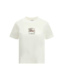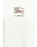The printed T-shirt by Burberry in white embodies the essence of contemporary elegance expressed through a classic silhouette. The regular fit with short sleeves and a subtle crew neck highlights refined simplicity, while the smooth, carefully selected cotton ensures exceptional comfort and a soft, premium feel. The chest features an intricate embroidery depicting a horseman surrounded by floral motifs, including leaves and flowers in shades of green, pink, and red. Beneath the artwork, the finely embroidered BURBERRY lettering stands out, symbolizing the heritage and impeccable style of the iconic fashion house.