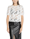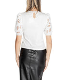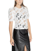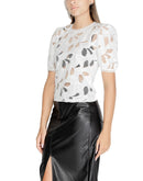 The Morgan De Toi women’s t-shirt, model 232-DROUL, is a stylish and trendy piece designed to enhance any outfit. Made from 100% polyester, this short-sleeved t-shirt features an elegant perforated pattern with geometric motifs, creating a sophisticated see-through effect. The slightly puffed sleeves and straight cut make it suitable for both casual looks and more formal occasions. The neckline and sleeve finishes are enriched with contrasting details that add a touch of originality. A versatile and lightweight garment, perfect for the spring-summer season.