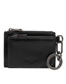 crafted in Italy from smooth premium leather. This sleek accessory combines practicality and luxury, featuring dual zip compartments and an integrated metal keyring and chain