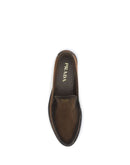 The Loafers by Prada crafted from vintage-effect suede leather, featuring a laminated logo printed on the vamp. Designed with a rounded toe and an internal printed logo, they express a timeless and elegant aesthetic.
