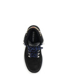 Burberry’s Moor hiking Boots combine technical style and iconic details. Made in Italy from suede, they feature a lightweight sole and leather padding at the ankle, enhanced by a Burberry Check patterned knit insert in the signature sand color. The Equestrian Knight Design is embroidered on the back, while the laces feature stripes in Knight Blue. A lace-up closure, round toe and engraved logo on the sole complete the design.