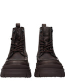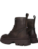 The product with MPN 4F00080M4382257 and code F85396 leather in brown is a ankle boots designed by Moncler. It has features like front logo, back logo, intentionally distressed areas may vary, intentionally discolored areas, vintage effect, aged effect.