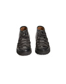 Introducing the epitome of bold sophistication, the ‘Roberto Pepe Luxury’ Lace-up Ankle Boots. Crafted from premium calfskin, these Italian-made boots are the ultimate fusion of durability and style. They captivate with a sleek black hue, robust laces through gleaming metal rings, and a chunky, black rubber sole that asserts confidence with every step. Perfect for the trendsetters looking to make a statement.