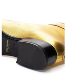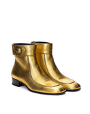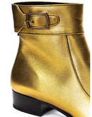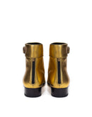 Made of gold-colored leather, square toe, visible stitching, strap with buckle above the ankle, rear zipper, black leather outsole. Heel height: 3 cm. Composition: 100% Leather.