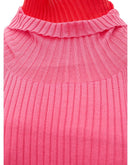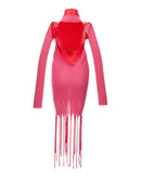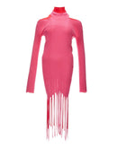 Bottega Veneta Stretch Knit Long Dress with Fringes, doubled with two fabrics in pink and red, mock neck, long sleeves, stretch ribbed knit, sheath pattern, long two-tone bangs on bottom. SKU Item: 631324 VKWM0. Composition: 57% Cotton, 43% Silk-Sku inside:23OT45