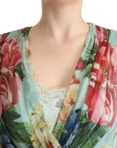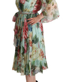 Dolce & Gabbana Green Floral Long Sleeves V-neck Midi Dress