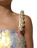 Gorgeous brand new, 100% Authentic Dolce & Gabbana mini-dress silhouette with a unique design, featuring an iridescent, scale-like texture and pearl-embellished straps. Constructed from numerous small, square or rectangular pieces that create an iridescent, possibly reflective or holographic effect, reminiscent of scales or sequins.