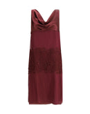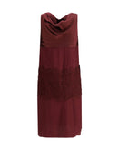 Ferragamo’s Draped Dress is a refined contemporary reinterpretation of 1920s elegance. Made of a blend of silk chiffon, satin, and embroidery, it is distinguished by wide bands that wrap the silhouette harmoniously. The draped neckline enhances shoulders and neckline, while the central inlay gently lowers the waist, creating an elegant see-through effect. A sophisticated garment designed for special occasions.