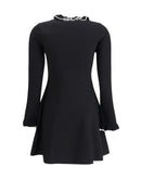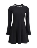 Valentino’s knit Dress features a flared silhouette that delicately enhances the silhouette. The long sleeves are finished with soft ruffles at the bottom, while the high neck is embellished with an elegant ruffle that adds a feminine and sophisticated touch.
