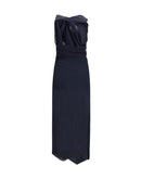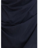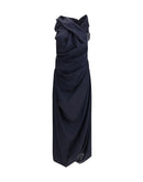 The Halter Galatea Dress by Vivienne Westwood shapes the figure with refined draping in semi-sheer wool, crafted with deliberately irregular seams for a unique asymmetric effect. The halter neckline cascades into folds that cinch at the waist, enhancing the silhouette and flowing into a column skirt. Sleeveless, with soft draping, a fitted waist, and an asymmetric hem, this dress is both elegant and contemporary.