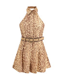 Zimmerman’s Leopard Short Dress combines a bold pattern with refined details. Featuring a concealed back zipper closure and partial front button closure, the design offers practicality and elegance. Side-stitched pockets add discreet functionality, while the lightweight, natural linen fabric is complemented by a detachable raffia belt that defines the waist with a summery, sophisticated touch.