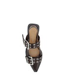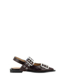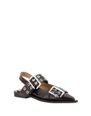 Buckle Ballerinas by Ganni featuring elongated toe, two adjustable front buckles, block sole, slingback style, patent leather design.