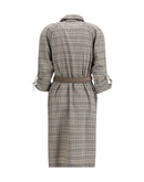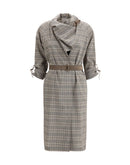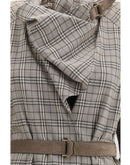The wool Check Dress with a shawl collar by Burberry features a regular fit and runs true to size; selecting your usual size is recommended. The piece includes a wool belt with a slight stretch, woven in the iconic Burberry Check pattern. The shawl collar can be worn open or closed like a scarf thanks to the detachable suede throat latch, while the matching B-shaped buckle straps allow the sleeve length to be adjusted. The front button fastening completes the design, offering both functional elegance and a distinctive aesthetic.
