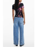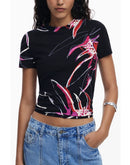Exude an eclectic charm with this Desigual ‘Lala’ T-shirt. Designed for the bold and the fearless, it’s the perfect blend of comfort and statement style. Flaunt Desigual’s signature print with pride, as the eye-catching logo takes center stage against the timeless black backdrop. With a snug crew neck and the ease of short sleeves, this T-shirt is crafted from a luxuriously soft mixture of elastane and viscose, ensuring a flattering fit that’s as comfortable as it is stylish. Made with love in India, it’s an essential addition to your wardrobe that speaks volumes of your unique fashion sense.