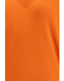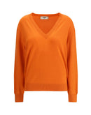 The Sweater by Fendi is an oversized style crafted from lightweight pure cashmere in a vibrant orange shade. Featuring a V-neckline and long low-set sleeves, it offers a soft, relaxed silhouette. Ribbed trims add refined structure, while tonal embroidered Fendi lettering on the lower left side provides an iconic yet understated finishing touch.