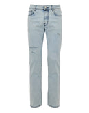 In cotone stretch azzurro a righe con piccoli strappi, cinque tasche, allacciatura con bottone metallico e bottoni coperti, regular slim fit, ricamo J sul taschino. Sul retro tag in cavallino bianco con logo applicato, impunture blu scure a contrasto. In vendita con bandana in cotone e profumati con esclusiva fragranza Jacob Cohen.