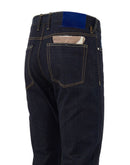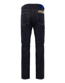 Tailoring line. Made from dark blue non-stretch cotton, five pockets, concealed button and button fastening, tapered fit with a straight leg and low crotch. Electric blue pony hair tag on the back with a micro logo trim and contrasting stitching. Sold with a cotton bandana and scented with the exclusive Jacob Cohen fragrance. Composition: 65% Polyester, 35% Cotton