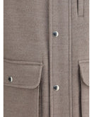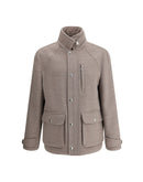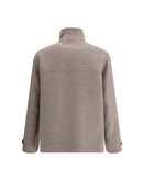 Brunello Cucinelli’s wool Jacket is a sophisticated and functional piece with a high collar fitted with a flap and button to close it, adding an elegant touch. The double-slider front zipper closure, enhanced with a flap and buttons, gives it a distinctive and practical design. The two flap patch pockets on the front provide ample space, while the vertical zippered breast pocket adds an element of functionality. Adjustable button cuffs complete the look, ensuring a custom fit and a touch of refined style.