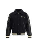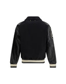 The Golden Collection bomber Jacket by Golden Goose in fabric features a relaxed boyfriend fit with striking contrast details in white. Leather sleeves with tone-on-tone patches outlined in white enhance the design, while the front button closure and two front pockets combine practicality with style