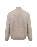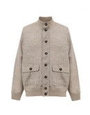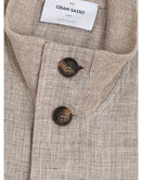 In beige linen, brown button closure, two front pockets with buttons, knitted turtleneck collar and elasticated waistband.