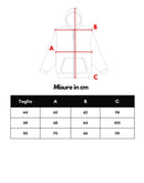 In red, blue and ivory, front fastening with white zip, two side pockets closed with zip, adjustable hood with pullers, adjustable elastic waist, internal lining