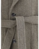 The wool and alpaca Coat by Lemaire embodies the brand’s understated sophistication. Crafted from a fine wool and alpaca blend, it features notched lapels, a front button closure, and a self-tie belt that cinches the waist for a naturally elegant silhouette. The design includes two front patch pockets, adjustable cuffs with straps, and a central back vent. Unlined, it offers a refined lightness that enhances its modern and effortless appeal.