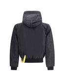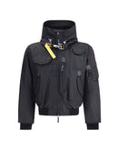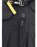 The Gobi bomber Jacket by Parajumpers is made of recycled and laminated nylon oxford with a water-repellent treatment. It features a double-slider front zipper closure and adjustable drawstring hood. It has six exterior pockets, including the iconic cargo pocket, and two interior pockets. Cuffs and bottom are ribbed for a comfortable fit. Completing the design are the Parajumpers patch on the sleeve and the iconic removable yellow tape hook and loop neck closure.