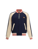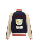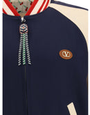Virgin wool bomber Jacket signed Valentino, part of the Le Chat De La Maison capsule. The model features a ribbed collar with contrasting stripes, front closure with a double-slider zipper and puller decorated with multicolored beads. Featuring raglan sleeves, two side welt pockets, ribbed cuffs and hem for a defined fit. The front features a golden metal VLogo plaque, while the back panel is embellished with the iconic embroidered cat monogram. An exclusive garment that combines tailoring, originality and unmistakable style.