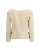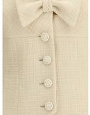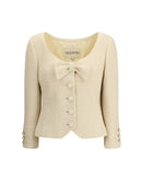 The Short Jacket in Plain Wool Tweed by Valentino captures classic elegance with a romantic twist. The structured fabric enhances the compact silhouette, enriched by a wide neckline that balances femininity and poise. The front soutache button fastening adds a refined sartorial detail, while the bow introduces a delicate and distinctive accent. A sophisticated piece, ideal for completing elegant looks.