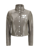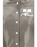 The Reedition Vinyl Jacket by Courrèges reinterprets the iconic 1971 model with a contemporary design. Made of shiny vinyl, it features the white AC logo inlaid on the chest, two side pockets and snap button closure at the center and cuffs. A high collar and fitted fit complete the look, while the lined jacket is designed to be worn open, combining iconic style and modern comfort.