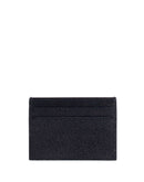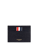 Leather Card Holder by Thom Browne, card slots on front and back, iconic striped tag on front, printed logo on bottom.