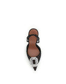 The Camelia Sling 105 Pumps in Polka-Dot Lace by Amina Muaddi embody refined femininity and contemporary allure. Crafted from black polka-dot satin, these pumps feature a pointed toe adorned with a rectangular mirrored embellishment for a touch of glamour. The slingback strap ensures a graceful fit, while the brand’s signature 105mm sculptural heel adds a modern, elevated finish — perfect for evening elegance.