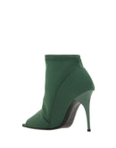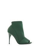 Bruno Frisoni’s Bootie Pumps combine a contemporary design with refined details. Made of stretch fabric with a wrap-around effect, they feature a square toe that is open at the front and adds a touch of originality. The leather stiletto heel slims the figure, while the logo-embossed insole adds an exclusive and distinctive detail.
