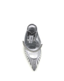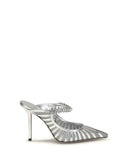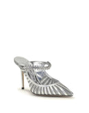 The Bing 100 Sabot by Jimmy Choo feature a silver metallic weave. The crystal band, a detail that characterizes the brand gives light and makes the shoe a precious accessory capable of standing out any look.