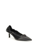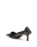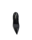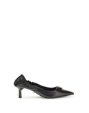 Prada’s logo Pumps are made of leather and feature a soft, tapered silhouette. The pointed toe model features a deconstructed design, enhanced by an elastic back that ensures comfort and fit. The architectural heel, inspired by the geometry of Prada’s iconic triangle, completes the look with a modern and distinctive touch, while the triangular logo on the front elegantly signs the model.