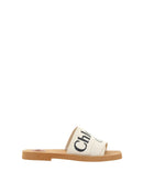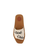 Cotton Woody Sandals by Chloé, square toe, flat sole, branded insole, double front fabric band with iconic brand signature printed in contrast.