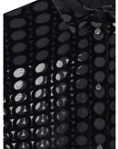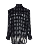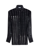 Ferragamo’s velvet devoré Shirt plays with sophisticated transparencies and a Gancini pattern that recalls the brand’s heritage. Its essential construction, characterized by an asymmetrical, rounded bottom, makes it perfect for elegant occasions, combining contemporary style and refined tradition.