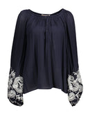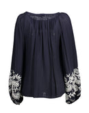 long sleeve blouse, wide neckline, 3 buttons, wide sleeves with elastic cuffs, embroidery, logo