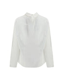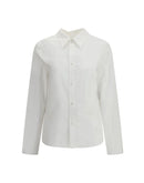 The Long-sleeved Shirt by MM6 Maison Margiela plays with the illusion of layering, designed to mimic the effect of two garments worn together. A pointed collar and button-front fastening preserve a sense of essential elegance, while the raw-cut hem adds a contemporary edge. The embroidered MM6 numeric logo on the front serves as a distinctive hallmark, balanced by the Maison’s signature white horizontal stitch on the back.