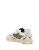 Re-Web Sneakers by Gucci are a blend of urban style and sophistication, with distinctive details that recall the brand’s identity. The front lace-up closure ensures a comfortable and adjustable fit, while the brand’s iconic signature is applied in contrast on the front tab, adding a recognizable touch. The brand’s signature GG logo is repeated all-over, creating an eye-catching visual effect. The paneled design and flat sole complete the look, giving the sneakers a modern and versatile look.
