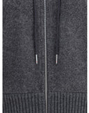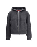Wool Sweatshirt by Thom Browne with adjustable drawstring hood and ribbed hem. The style features a double-slider front zipper closure, two side welt pockets, and ribbed cuffs and hem for a comfortable fit and a refined design.