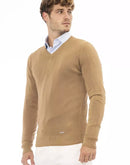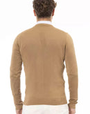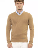 Elevate your wardrobe with the luxurious touch of Baldinini Trend’s V-neck Sweater. Crafted for the style-conscious, this piece features long sleeves and rib-knit accents at the neck, cuffs, and hem, ensuring a sleek, regular fit. The subtle beige palette is crowned by the standout Baldinini Trend metal monogram, showcasing elegance with a bold edge. Perfect for those who demand trendsetting sophistication combined with comfort.