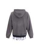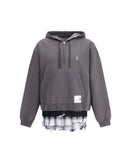 The Triple Layered Half Zip Hoodie by Maison Mihara Yasuhiro features an oversized silhouette blending streetwear edge with tailored details. A checked shirt is attached at the hem, creating a distinctive layered effect. The chest is adorned with “Leon,” the brand’s original embroidered character. The fabric undergoes washing and distress treatments to achieve a vintage, lived-in look, true to Maison Mihara Yasuhiro’s signature aesthetic.